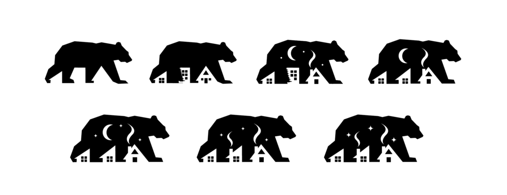 Rapid sketches explored bears, homes, and symbolism. Final logo reflects guardianship, warmth, and family inspiration.